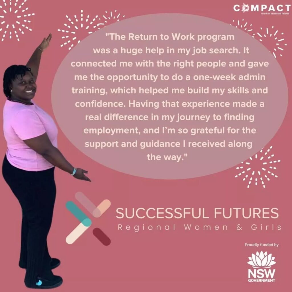 Returning to work after a break can feel daunting, especially when navigating job applications, interviews, and workplace expectations. But for Lydie, COMPACT’s Return to Work – Women & Girls Program provided the support, guidance, and opportunities she needed to take the next step in her career.
